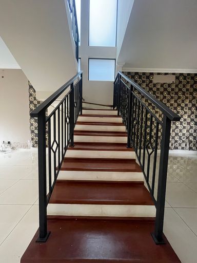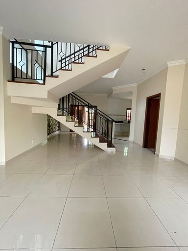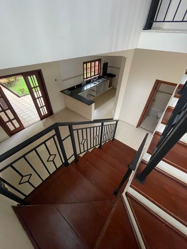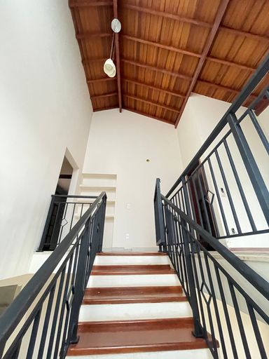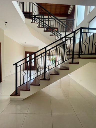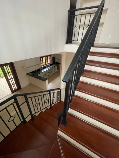 O imóvel se destaca por uma belíssima escada em madeira, que valoriza o projeto arquitetônico e imprime sofisticação logo na entrada.