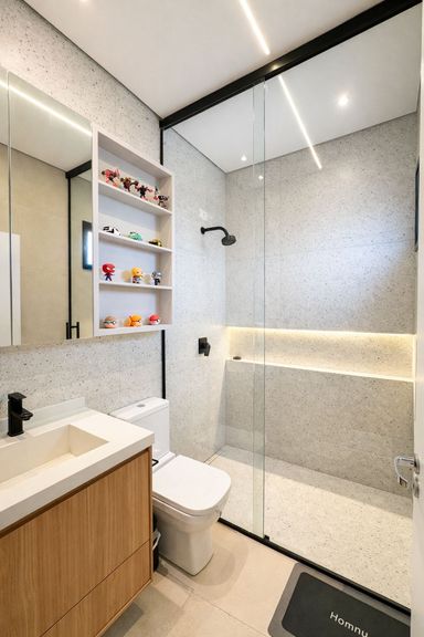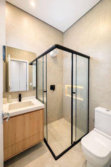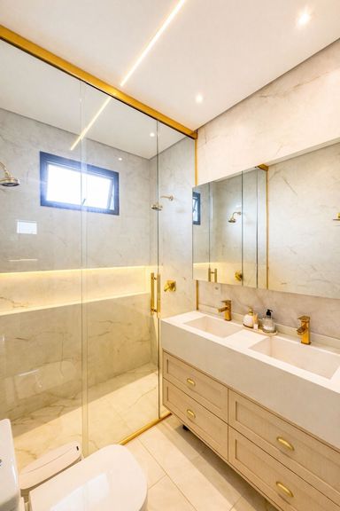 Os banheiros possuem box até o teto, acabamento refinado e padrão superior.