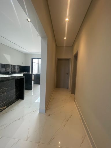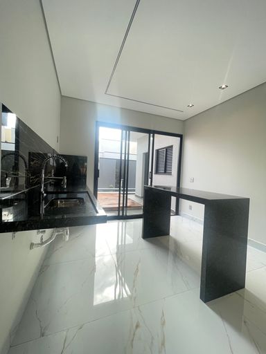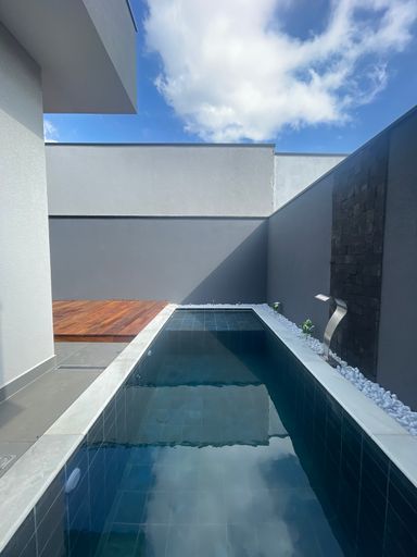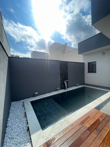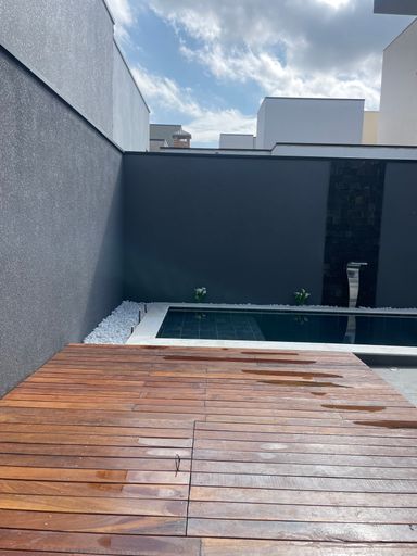 Casa térrea com três suítes, piscina com deck de madeira, cozinha e sala integradas, pé-direito duplo e excelente localização dentro do condomínio.