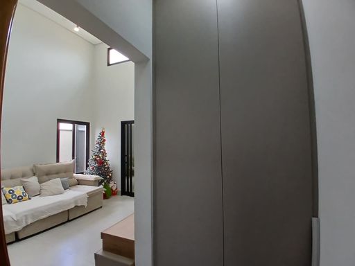 ✨ Sala com pé-direito alto e porta central icônica que integra ou separa os ambientes